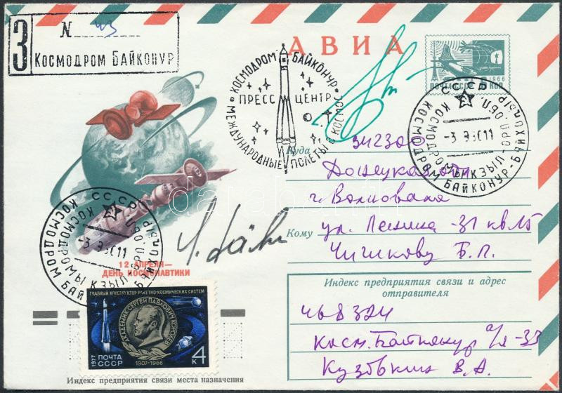 Valerij Bikovszkij (1934- ) szovjet és Sigmund Jähn (1937- ) német űrhajósok aláírásai emlékborítékon /