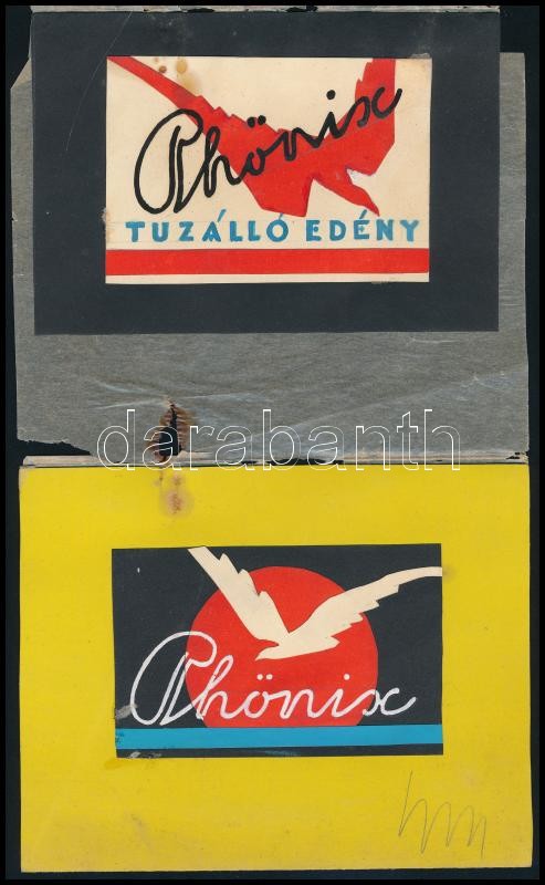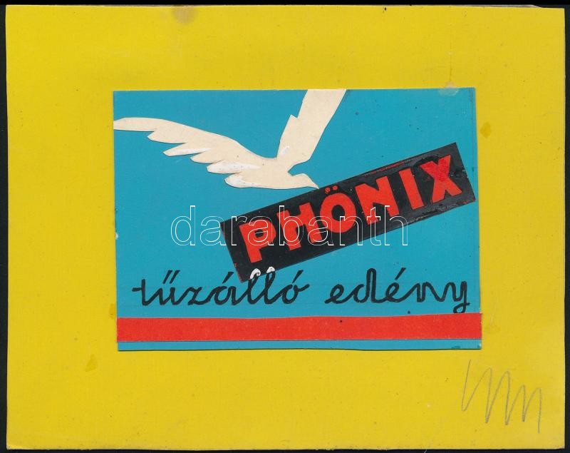 Galambos Margit (?-?): Phönix tűzálló edény. 3 db art deco reklámterv, 1925-30 körül. Tempera, ceruza, kollázs, karton, kartonra kasírozva, hártyapapírral védve. 2 db jelzett, 1 db jelzés nélkül. Kissé foltos. 7x10 cm körüli méretekben.