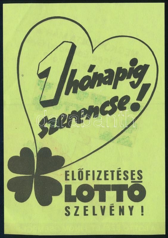 LOTTÓ szelet / 1 hónapig szerencse! szórólap https://www.darabanth.com/de/420-Fernauktion/420.0/Kunst-Dokumente-andere-Sammelgebiete/Werbungen~500022/LOTTO-szelet-1-honapig-szerencse-szorolap~II2660235