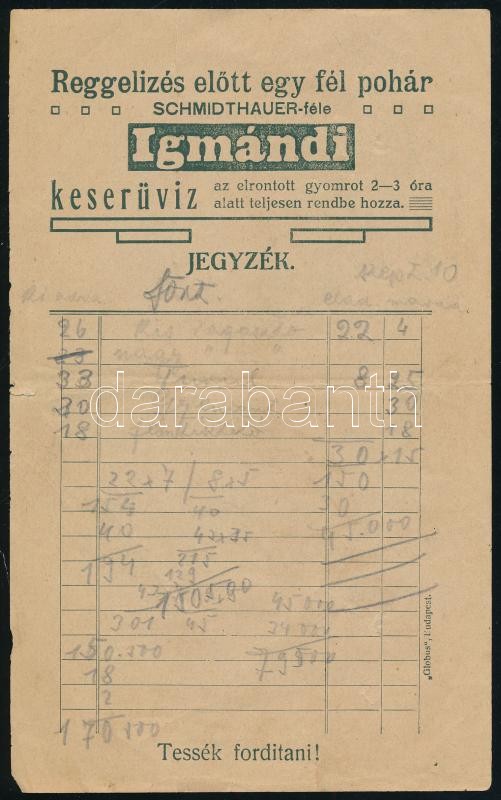cca 1910-1930 Igmándi Keserűvíz, kétoldalas reklámlap, számla, kisebb ... https://www.darabanth.com/de/420-Fernauktion/420.0/Kunst-Dokumente-andere-Sammelgebiete/Werbungen~500022/cca-1910-1930-Igmandi-Keseruviz-ketoldalas-reklamlap-szamla-kisebb-szakadassal-20x12-5-cm~II2660837