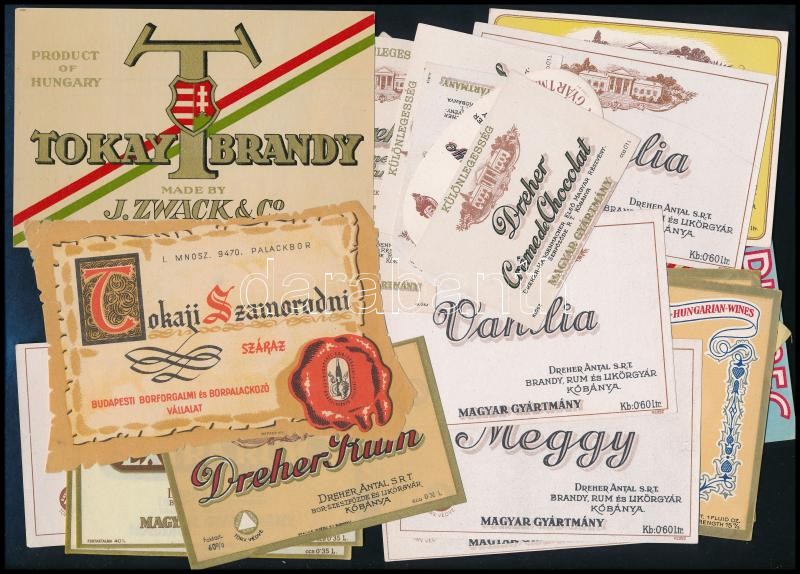 cca 1940 Vegyes italcímke tétel, 26 db, nagyrészt háború előttiek, de közte pár háború utánival is, köztük számos Dreher gyártmányú ital címkéje, Cahteau Palugyay, Tokaji borcímkék, Dr. Noseda Triple Sec, Dr. Noseda Vérnarancs, Kecskemét Barack-Pálinka, valamint Zwack Tokay Brandy 'Kossuth-címeres' grafikával (Offset-ny.), 13x11 cm és 8x5 cm közötti méretben