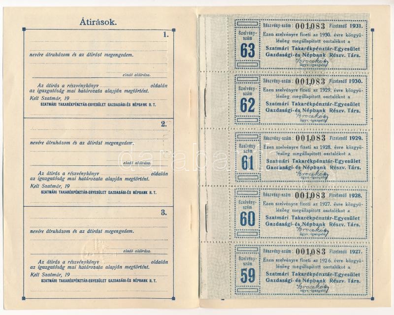Szatmár 1920. "Szatmári Takarékpénztár-Egyesület Gazdasági- és Né... https://www.darabanth.com/de/420-Fernauktion/420.0/Numismatik/Aktien-und-Tickets~2000005/Szatmar-1920-Szatmari-Takarekpenztar-Egyesulet-Gazdasagi-es-Nepbank-Reszvenytarsasag~II2626198