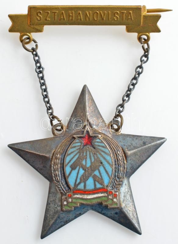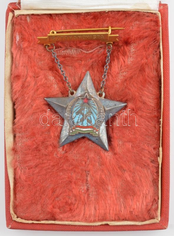 ~1950. "Sztahanovista" zománcozott fém kitüntetés tokban T:2 patina, ü., viseltes tok