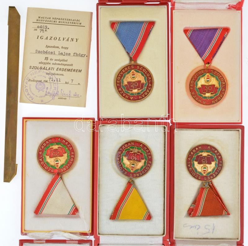 1965. "Szolgálati Érdemérem - A Haza Fegyveres Szolgálatában 10, 15, 20, 25, 30 év" (5xklf) zománcozott kitüntetés mellszalagon, tokban, kitüntetés tartó pánttal, az egyikhez igazolvány, T:2 némelyiken kis zománchiba, sérült, firkált tok
