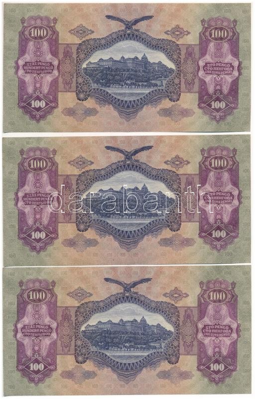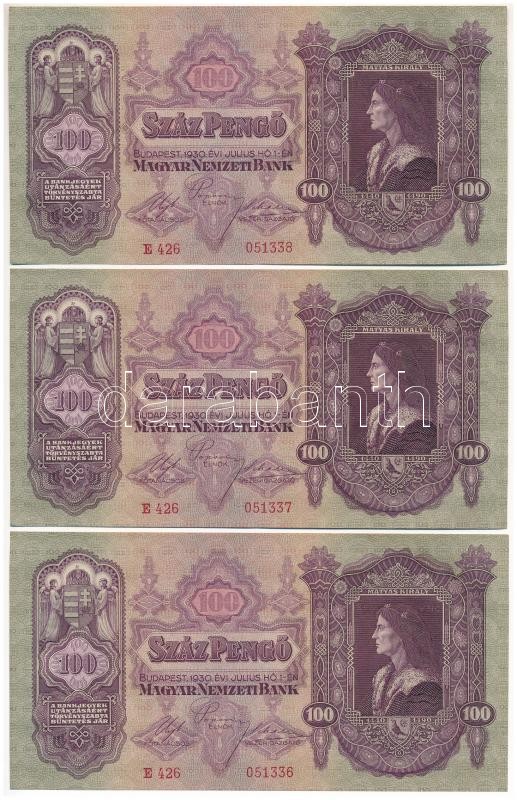 Hungary 1930. 100 Pengő (3x) consecutive serials "E 426 051336 - E 426 051338" C:XF