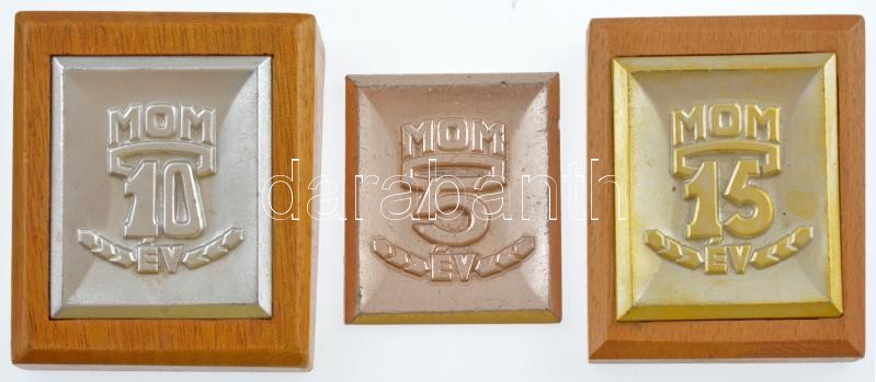 Beschreibung: ~1970. "MOM 5, 10 és 15 év" 3xklf Al plakett, ebből kettő fa talapzaton (59x50mm, talapzattal 78x67mm) T:2,2- az egyiken ph, karc