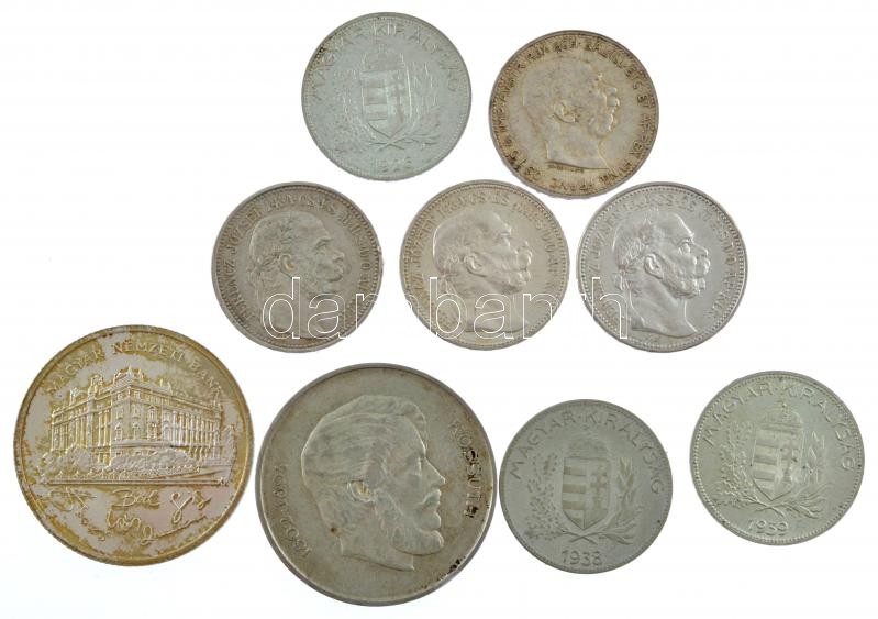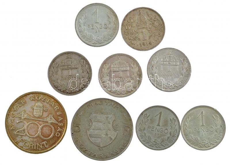 Beschreibung: 1915. 1K Ag (3x) "Ferenc József" + 1926-1939. 1P Ag (3xklf) + 1947. 5Ft Ag "Kossuth" + 1992. 200Ft Ag "MNB" + Ausztria 1914. 1K Ag "Ferenc József" T:1--2- patina, ph