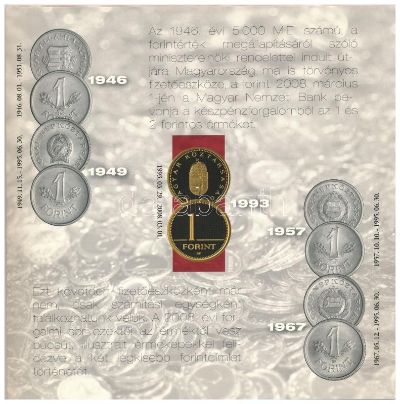 2008. 1Ft-100Ft (7xklf) "Búcsú az egy- és kétforintostól" fo... https://www.darabanth.com/de/420-Fernauktion/420.0/Numismatik/Ungarische-Munzen-und-Munzen-mit-ungarischem-Munzzeichen~2000008/2008-1Ft-100Ft-7xklf-Bucsu-az-egy-es-ketforintostol-forgalmi-sor-szettben-TPP-Adamo-FO42~II2655581