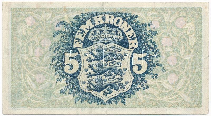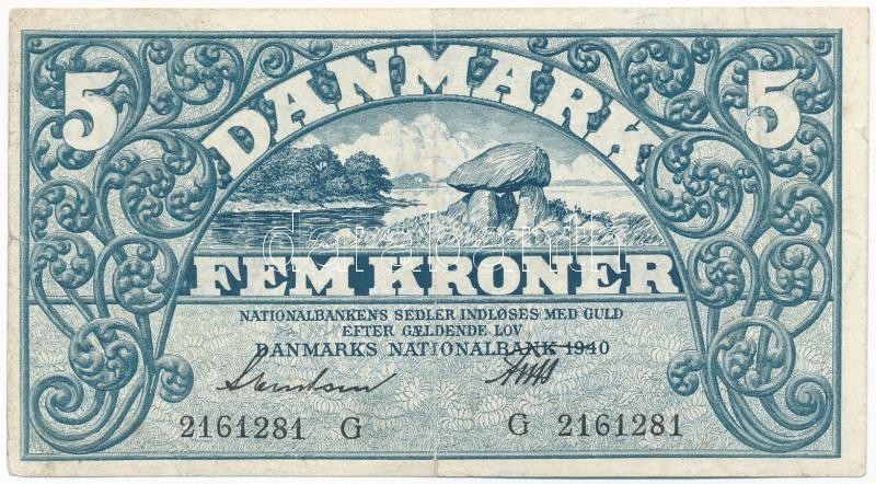 Dánia 1940. 5K "G" betűjel "Svendsen & Friis" ... https://www.darabanth.com/de/420-Fernauktion/420.0/Numismatik/Weltweit-Banknoten~2000015/Dania-1940-5K-G-betujel-Svendsen-Friis-TIII-kis-beszakadasok-Denmark-1940-5-Kroner-pref~II2655974
