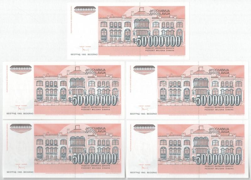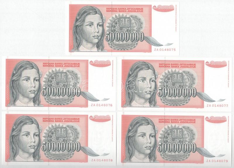 Yugoslavia 1993. 50.000.000 Dinara (5x) consecutive serials, replacement note "ZA 0148075 - ZA 0148079" C:UNC