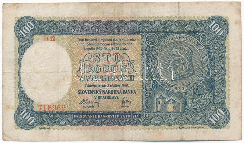 Slovakia 1940. 100 Korun "D 12 718969" C:F