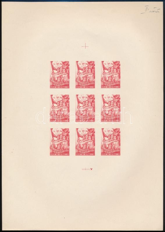 Beschreibung: 1957 Légrády Sándor: Szakszervezeti világkongresszus propaganda bélyeg 2 különböző színű próbanyomat ív ívenként 9 bélyeggel