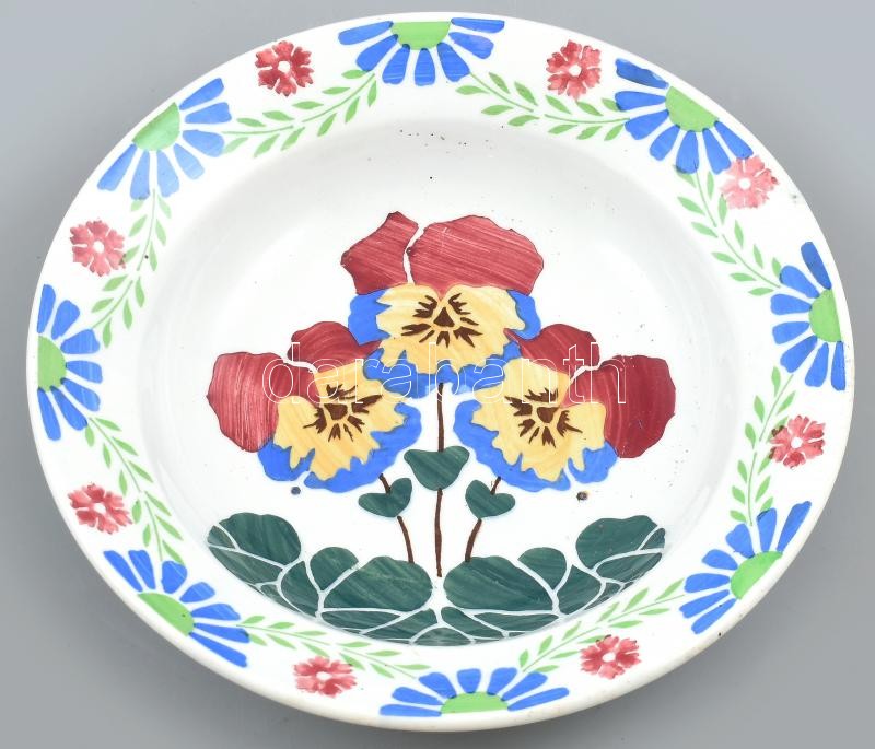 Beschreibung: Wilhelmsbur népi fajansz tányér, kopásokkal, jelzett d: 23 cm