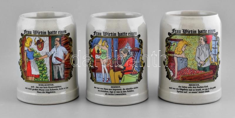 Beschreibung: 3db erotikus jelenetes német söröskorsó, kőedény, jelzett, hibátlan, m:13cm