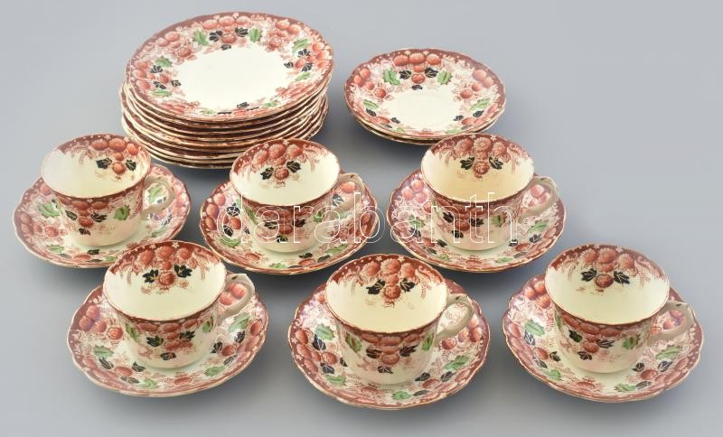 Beschreibung: G&W angol porcelán készlet, 6 db teáscsésze, 8 db csészealj, 9 db süteményes tányér, jelzett, kopásnyomokkal, hajszálrepedéssel