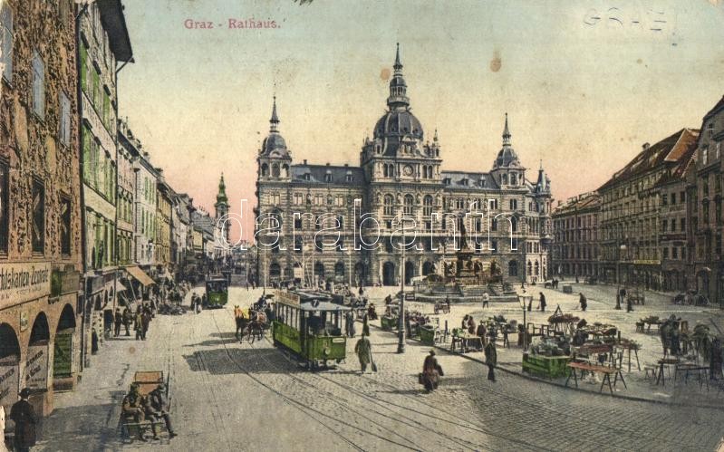 Graz, Rathaus / town hall, market vendors, trams, shops (Rb) https://www.darabanth.com/de/421-Fernauktion/421.0/Ansichtskarten/Osterreich~1500061/Graz-Rathaus-town-hall-market-vendors-trams-shops--Rb~II1644634