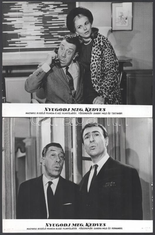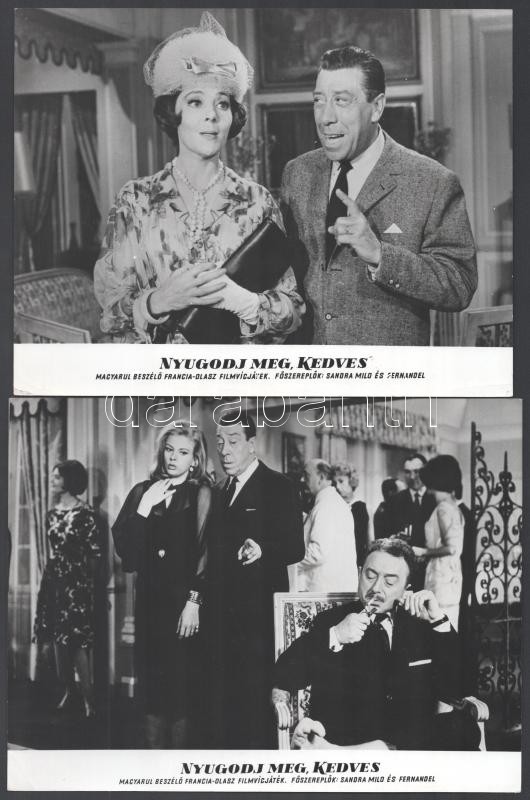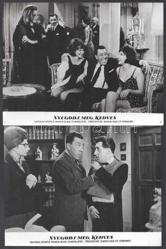 ,,Nyugodj meg, Kedves" című francia - olasz film jelenetei és szereplői (köztük Sandra Mild és Fernandel), 13 db vintage produkciós filmfotó (a használatból eredő kisebb hibákkal), ezüst zselatinos fotópapíron, 18x24 cm