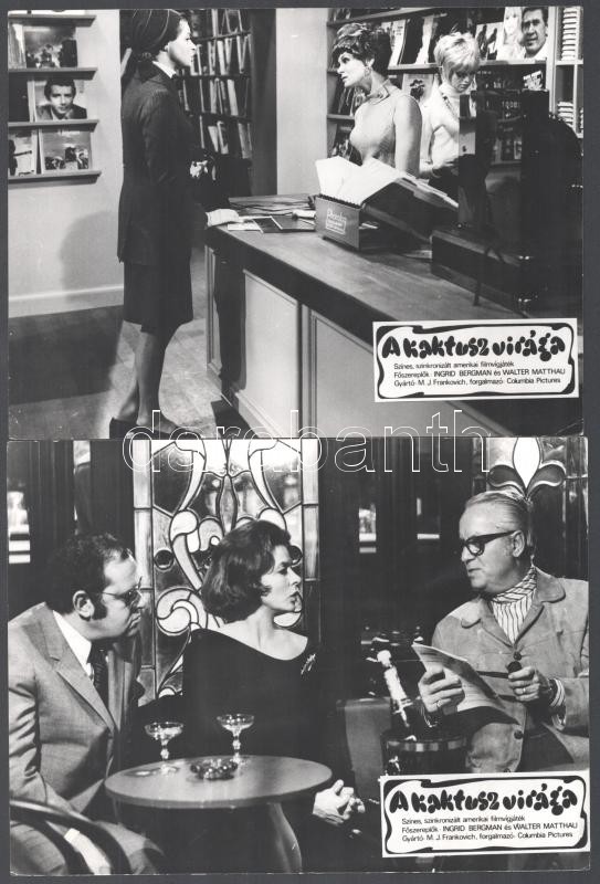 1969 ,,A kaktusz virága" című amerikai film jelenetei és szereplői (köztük Ingrid Bergman, Walter Matthau), 7 db vintage produkciós filmfotó (a használatból eredő kisebb hibákkal), ezüst zselatinos fotópapíron, 18x24 cm