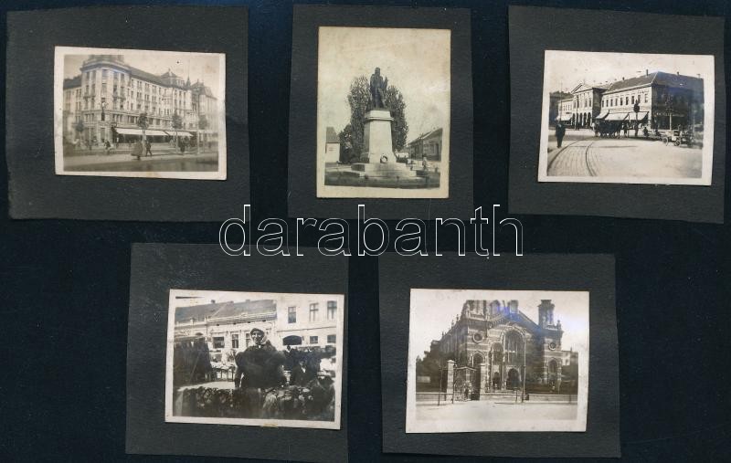 Beschreibung: cca 1930 Debrecen, neológ zsinagóga, piac ruhaárussal, városháza, Arany Bika Szálló, Csokonai-szobor, 5 db kisméretű fotó, 3×4 cm