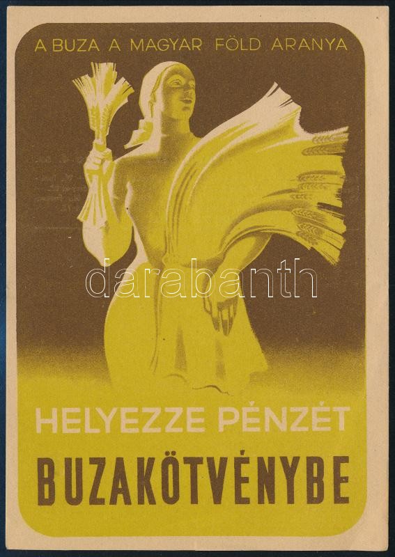 1946 "A búza a magyar föld aranya - Helyezze pénzét búzakötvénybe", Ma... https://www.darabanth.com/de/421-Fernauktion/421.0/Kunst-Dokumente-andere-Sammelgebiete/Werbungen~500022/1946-A-buza-a-magyar-fold-aranya-Helyezze-penzet-buzakotvenybe-Magyar-Orszagos-Kozpont~II2669915