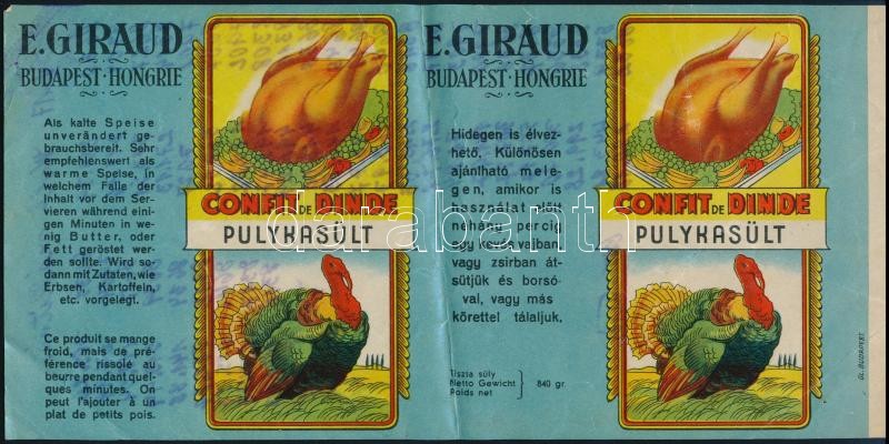 E. Giraud Budapest Hingrie pulykasült címke, hátoldalon kézírással, me... https://www.darabanth.com/de/421-Fernauktion/421.0/Kunst-Dokumente-andere-Sammelgebiete/Werbungen~500022/E-Giraud-Budapest-Hingrie-pulykasult-cimke-hatoldalon-kezirassal-mely-atut-az-eredeti-old~II2672371