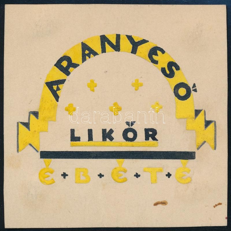 ÉBÉTÉ aranyeső likőr, Engl Bernát és Társa R.t,.art deco italcímke terv, 1930 körül. Tempera, ceruza, tus, karton. Jelzés nélkül, feltehetően Galambos Margit (?-?) alkotása. 7,5x7,5 cm.