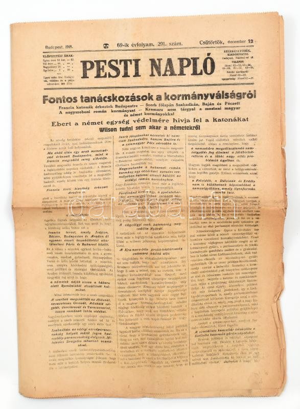 1918 Pesti Napló 69. évf. 291. sz. 1918. dec. 12., kis szakadásokkal a lapszéleken, benne a kor híreivel: "Fontos tanácskozások a kormányválságról", 12 p.