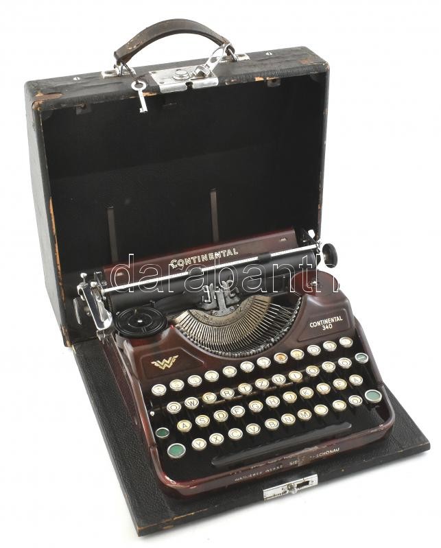 cca 1940 Continental 340 írógép, magyar billentyűzettel, saját dobozában, kulccsal, korának megfelelő, kissé kopottas állapotban, 33x31x14,5 cm / Continental 340 vintage typewriter in original case, with slight wear
