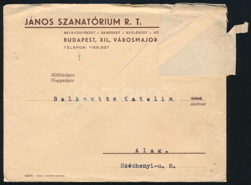 1942.IX.8 Ismeretlen levele, amely a Budapestet ért II. világháborús első légitámadásról számol be: (...) Nálunk a Városmajori templomot tette alaposan tönkre a bomba és ez a robbanás iszonyuan megremegtette azt a házat is, amiben én lakom (...) Mi most itt a szanatóriumban már gyűjtünk a Városmajori templom ujjáépítésére, az alkalmazottak között, eddig már 200,- pengőn felül gyűlt össze (...)". Más egyéb érdekes részlettel. Bő egy gépelt oldal, János szanatórium fejléces papírján, eredeti sérült János Szanatórium borítékban.