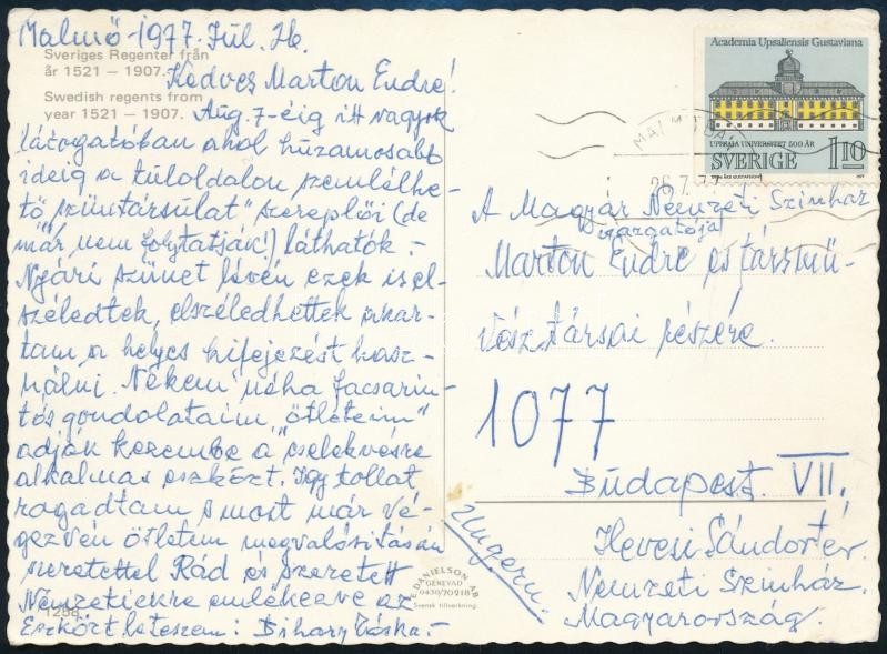 1977 Bihari József(1901-1981) kétszeres Kossuth-díjas színész saját kézzel írt és aláírt képeslapja Svédországból Marton Endre színházigazgatónak, jó állapotban