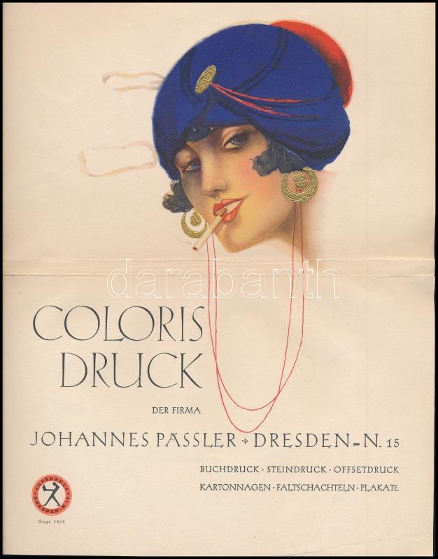 cca 1920-1930 Coloris Druck Dresden reklám, hajtott, 28×22 cm https://www.darabanth.com/de/422-Fernauktion/422.0/Kunst-Dokumente-andere-Sammelgebiete/Werbungen~500022/cca-1920-1930-Coloris-Druck-Dresden-reklam-hajtott-28C39722-cm~II2679694