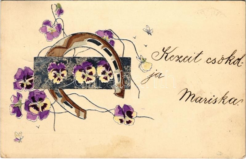 Beschreibung: 1900 Greeting card with horseshoe and flowers. Emb. litho (fl)