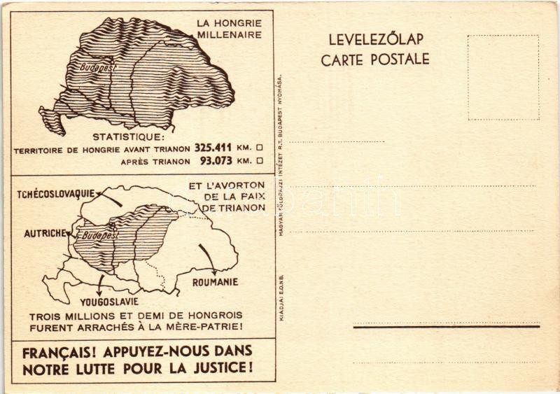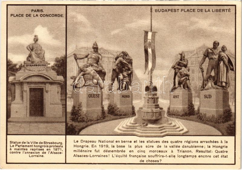 Concorde tér Párizsban és a Szabadság tér Budapesten. Trianon irredenta szoborcsoport, Országzászló. Magyar Földrajzi Intézet rt. nyomása / Paris, Place de la Concorde - Budapest, Place de la Liberté; Hungarian irredenta propaganda, Trianon map on the backside