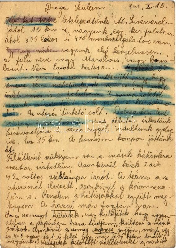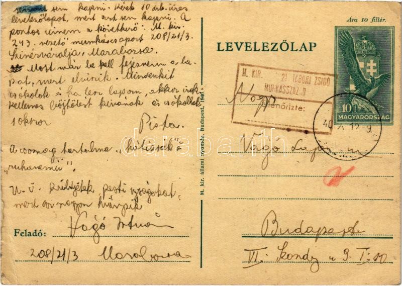 1940 Vágó István zsidó KMSZ (közérdekű munkaszolgálatos) tábori posta a 208/21/3. marosborsai tábori munkás század munkatáborból szüleinek címezve. Judaika / WWII Letter from a Jewish labor serviceman to his parents from the labor camp of Barzava. Judaica (EK)