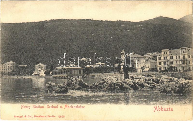 Abbazia, Opatija; Neues Slatina-Seebad u. Marienstatue / beach, statue... https://www.darabanth.com/de/423-Fernauktion/423.0/Ansichtskarten/Kroatien~1500008/Abbazia-Opatija-Neues-Slatina-Seebad-u-Marienstatue-beach-statue-EK~II2367726