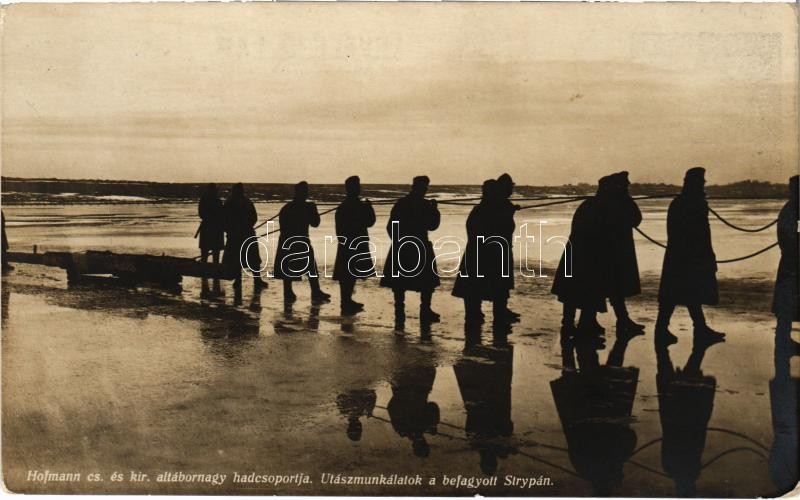 Utászmunkálatok a befagyott Strypán, Hofmann cs. és kir. altábornagy hadcsoportja. Hadifénykép Kiállítás, Hadsegélyező Hivatal kiadványa / WWI K.u.k. military, soldiers on Strypa River