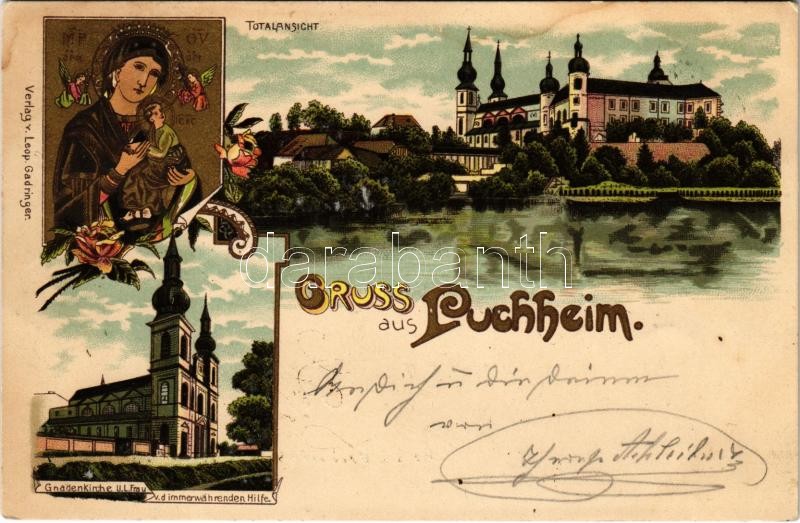 Beschreibung: Attnang-Puchheim, Gruss aus Puchheim. Totalansicht, Gnadenkirche. Verlag v. Leop. Gadringer. Art Nouveau, floral, litho (fl)