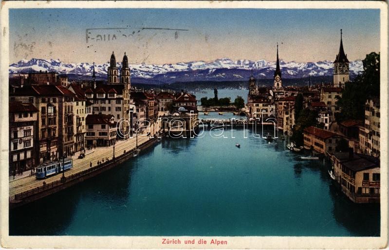 1928 Zürich, und die Alpen / general view, tram, bridge (EK) https://www.darabanth.com/de/423-Fernauktion/423.0/Ansichtskarten/Schweiz~1500049/1928-Zurich-und-die-Alpen-general-view-tram-bridge-EK~II2686209