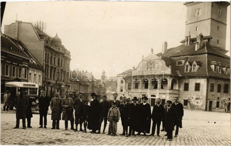 Brassó, Kronstadt, Brasov; Erinnerung an den Ausflug des K.I.B. / turisták, kirándulás emlékére, Fő tér, Tanácsháza, 3-as autóbusz, üzletek / tourists, main square, town hall, autobus. Foto Carmen photo