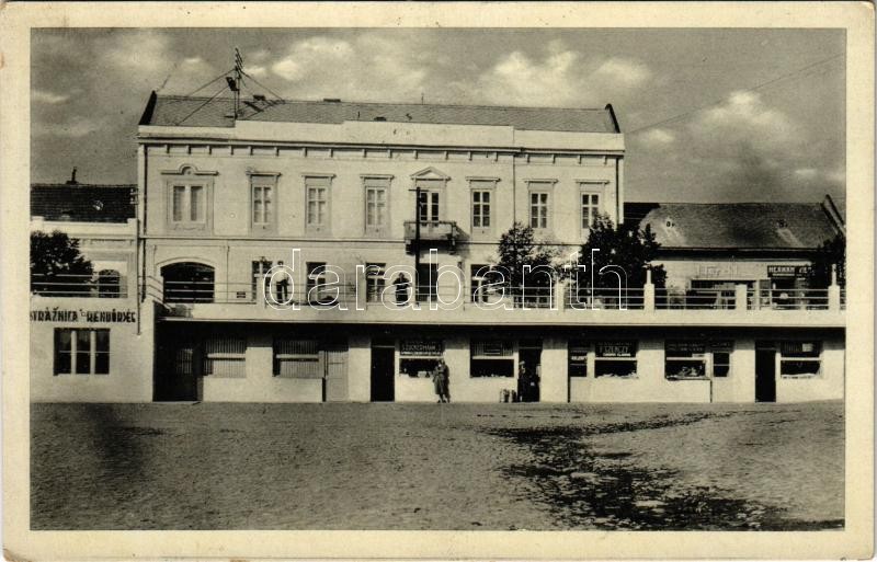 Beschreibung: 1938 Ipolyság, Sahy; Vásárcsarnok, rendőrség, Zuckermann S., Szenczy F., Glockner, Hermán és Torkei üzlete / Trznica / market hall, police station, shops