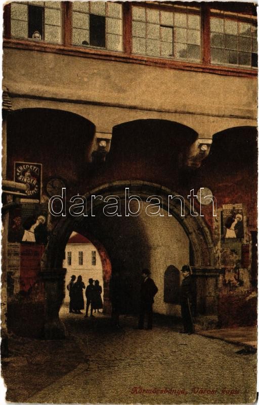 Beschreibung: Körmöcbánya, Kremnitz, Kremnica; Városi kapu, Eredeti Singer Varrógépek, Maggi ízesítő reklámok, csendőr. Ritter Sándor / gate, street, advertising posters, gendarme (EM)