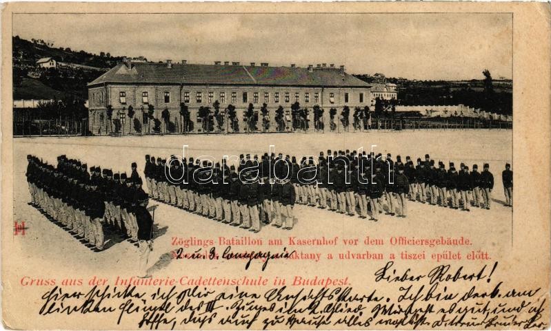 1899 (Vorläufer) Budapest II. Lipótmező, Hidegkúti út, Növendék zászlóalj a gyalogsági laktanya udvarán a tiszti épület előtt / Infanterie Cadettenschule, Zöglings Bataillon am Kasernhof vor dem Officiersgebäude (EK)