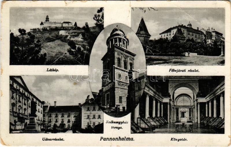 Beschreibung: 1937 Pannonhalma, látkép, főbejárat, udvar, könyvtár belső, székesegyház torony (fa)