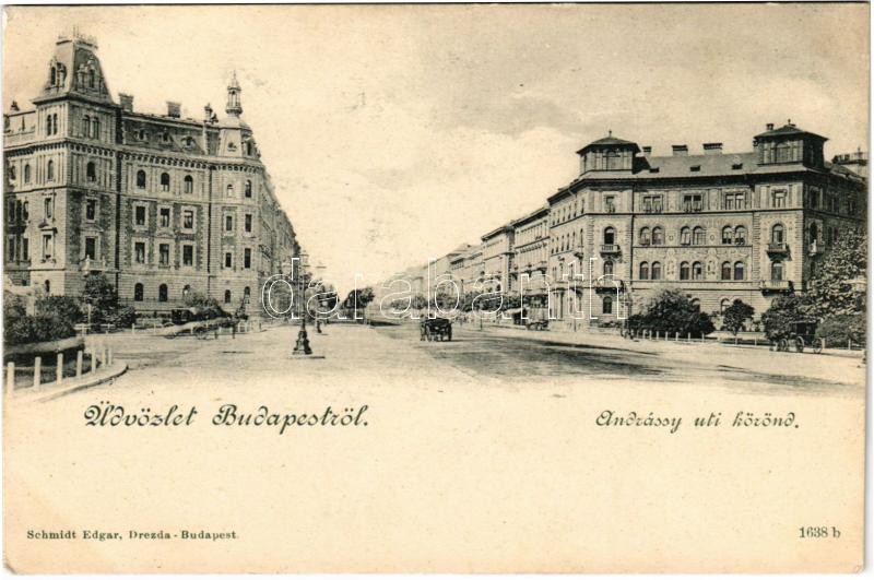 Budapest VI. Andrássy úti körönd. Schmidt Edgar (EK) https://www.darabanth.com/de/423-Fernauktion/423.0/Ansichtskarten/Ungarn~1500004/Budapest-VI-Andrassy-uti-korond-Schmidt-Edgar-EK~II2687375