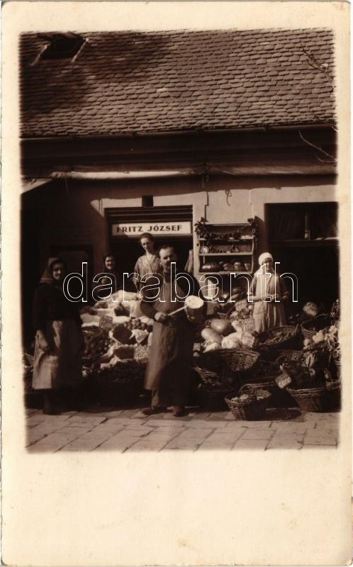 Beschreibung: Ismeretlen település, Fritz József vegyeskereskedő gyümölcs-zöldség és kenyér üzlete. photo (fl)