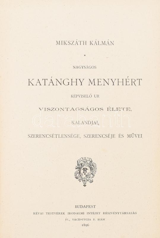 Mikszáth Kálmán: Nagyságos Katánghy Menyhért képviselő úr viszontagságos élete, kalandjai, szerencsétlensége, szerencséje és művei. Bp.,1896, Révai,(Pallas-ny.), 8+288 p. Kiadói aranyozott, festett egészvászon-kötés, Gottermayer-kötés, festett lapélekkel, a borítón kis kopásnyomokkal.