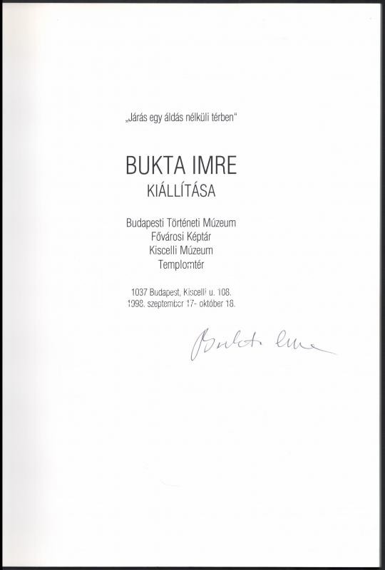 Bukta Imre kiállítása. A művész, Bukta Imre (1952-) által aláírt! Bp., 1998, BTM. Bukta Imre műveivel gazdagon illusztrált kiállítási katalógus. Kiadói papírkötés.