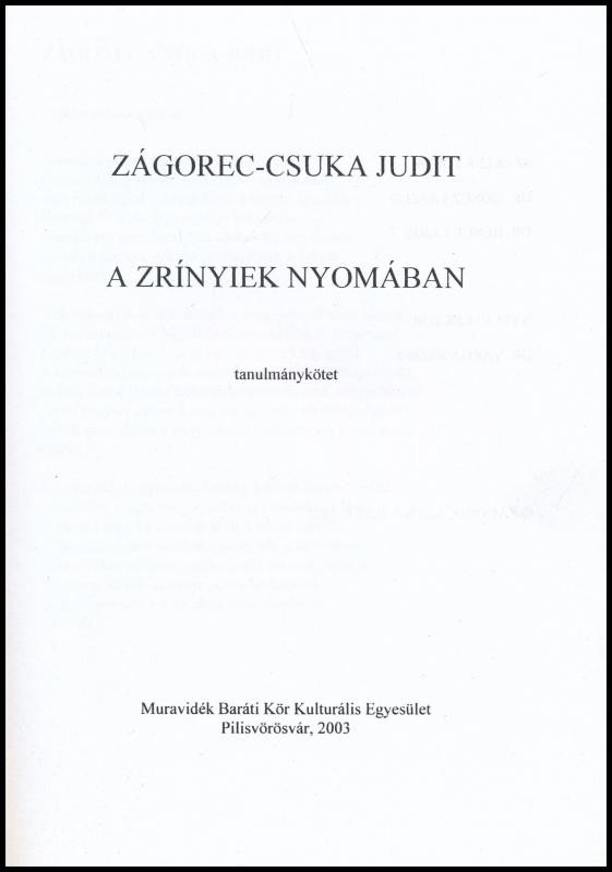 Zágorec-Csuka Judit: A Zrínyiek nyomában - Tanulmánykötet. Pilisvörösvár, 2003, Muravidék Baráti Kör Kulturális Egyesület. Megjelent 500 példányban. 75 p. Kiadói papírkötés.