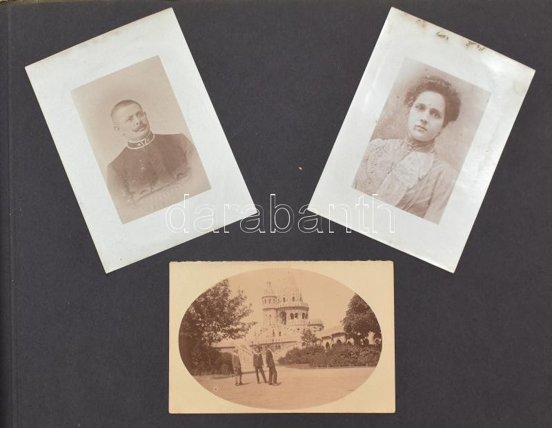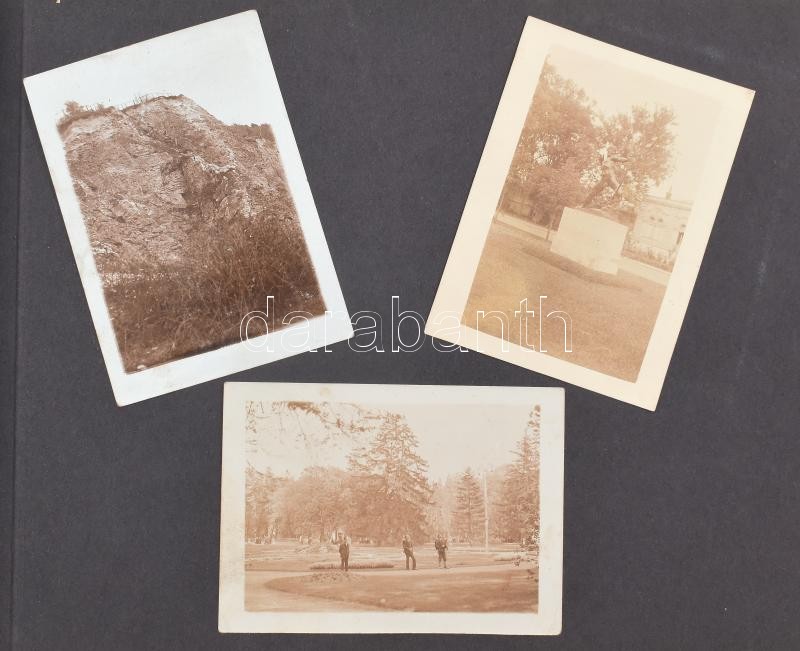 Beschreibung: cca 1920 Családi fotóalbum, egy-két katonai portréval, biciklis fotóval, kastélypark, Tahi hajó, stb, vegyes méretben