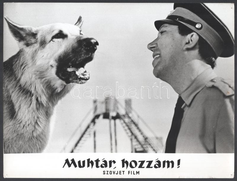 cca 1964 ,,Muhtár, hozzám" című szovjet film jelenetei és szereplői (a főszereplő egy jól kiképzett rendőrkutya), 9 db vintage produkciós filmfotó, ezüst zselatinos fotópapíron, a használatból eredő (esetleges) kisebb hibákkal, 18x24 cm